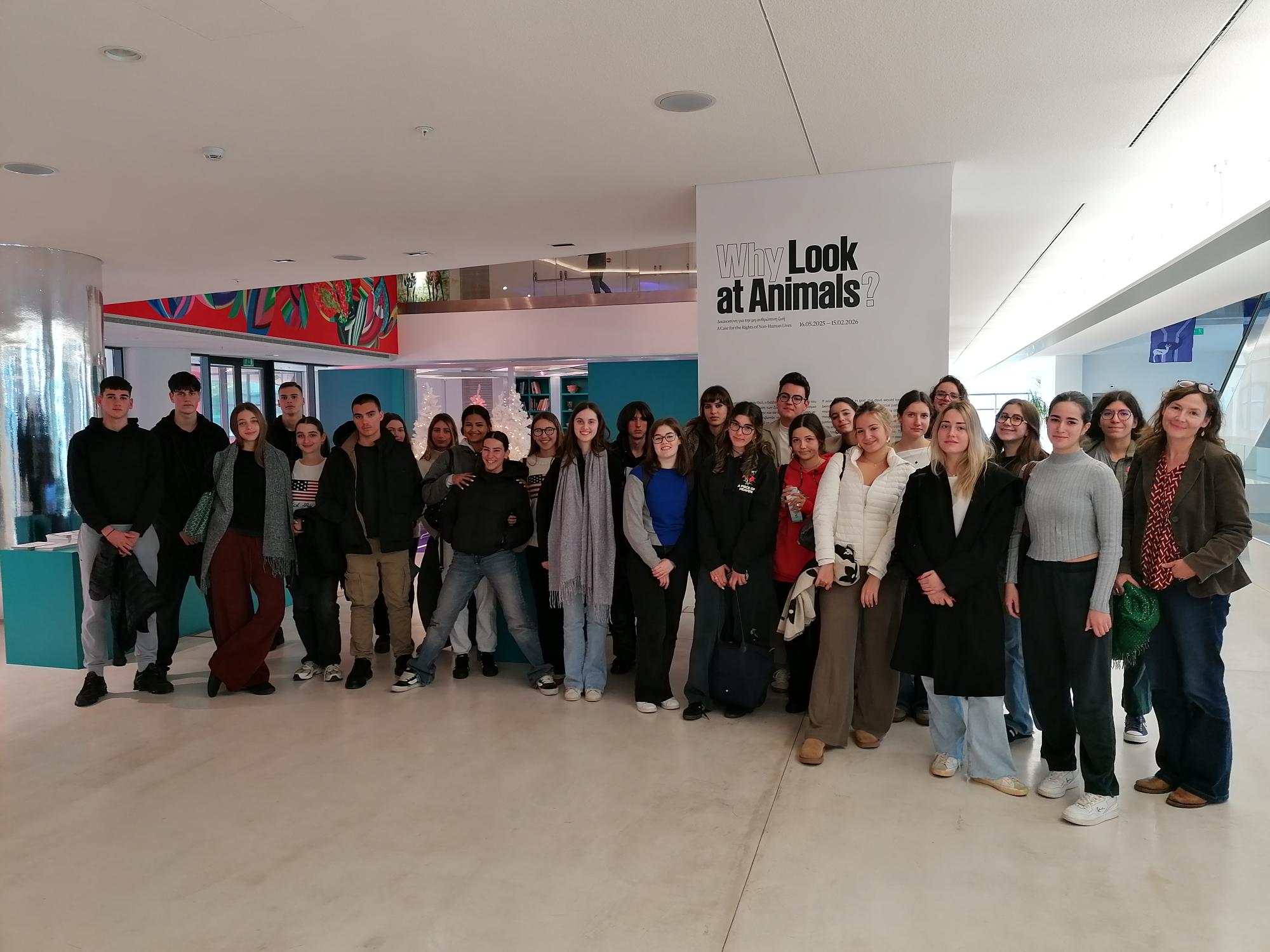 Mercredi 17 décembre les élèves de terminale T4 se sont rendus au musée d’art contemporain (EMST) à Syggrou/Fix. Dans le cadre du cours d’anglais, et dans le prolongement du chapitre consacré au réchauffement climatique et l’impact de l’élevage des animaux sur l’environnement, ainsi que de l’art éco-engagé visant à provoquer une réflexion sur les enjeux environnementaux, les élèves ont visité l’exposition « WHY LOOK AT ANIMALS? », accompagnés de leur professeures, Madame Husson et Madame Quéret.