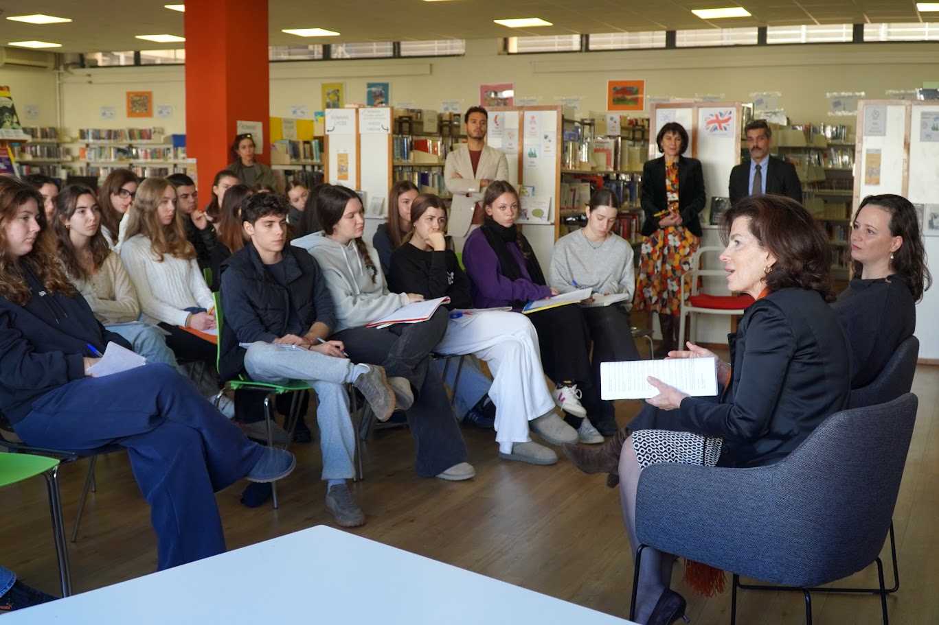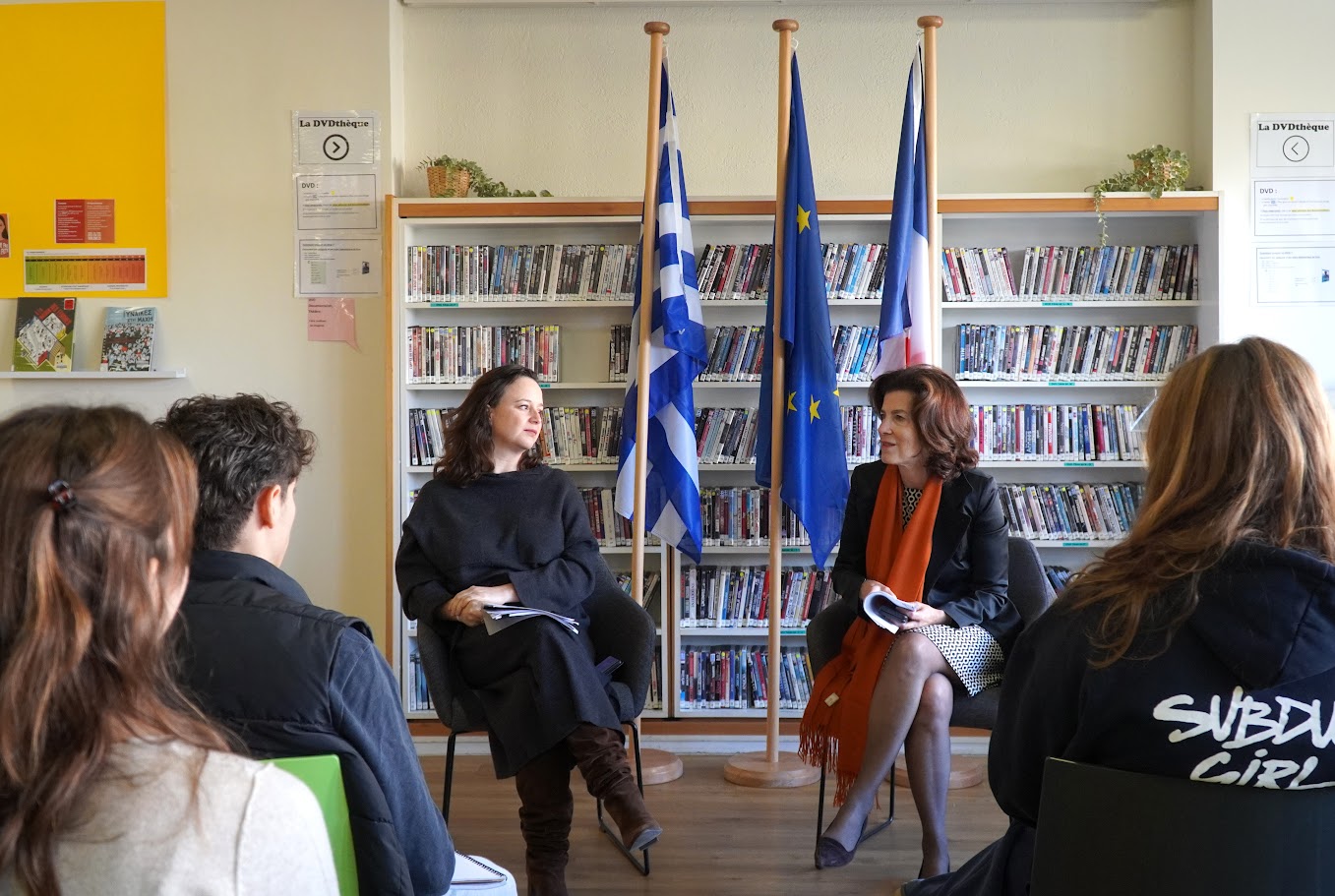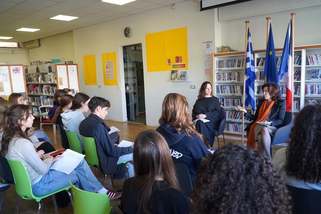 À l’occasion de la Journée internationale pour l’élimination de la violence à l’égard des femmes, le Lycée franco-hellénique Eugène Delacroix a eu l’honneur d’accueillir, ce lundi 25 novembre, Madame Laurence Auer, ambassadrice de France en Grèce, ainsi que Madame Diane Roeser, consule générale de France à Athènes.